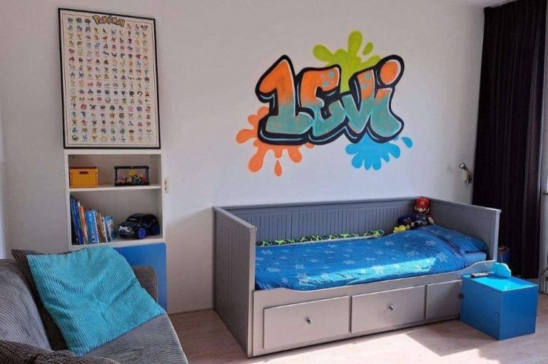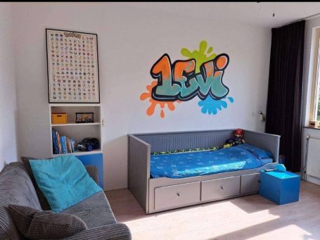 Geen ontwerp is hetzelfde. Ik ontwerp elk thema handmatig, afgestemd op de muur, het licht en de gewenste stijl  van bijvoorbeeld zachte pasteltinten en dromerige wolken tot stoere graffiti-letters en cartoonfiguren vol energie.