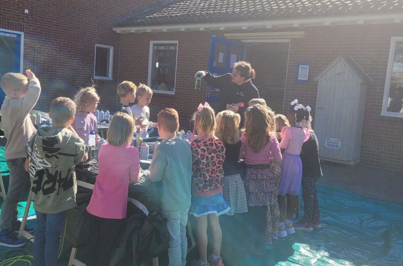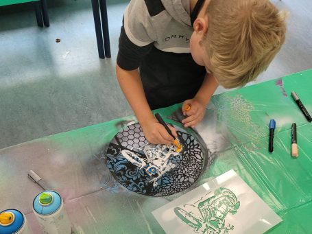 Elke workshop wordt volledig verzorgd: wij nemen al het materiaal mee. Spuitbussen, verf, bescherming, handschoenen, schorten en panelen. We zorgen voor een veilige werkomgeving met duidelijke uitleg over het gebruik van de materialen. Veiligheid, plezier en respect voor elkaars werk staan altijd centraal.