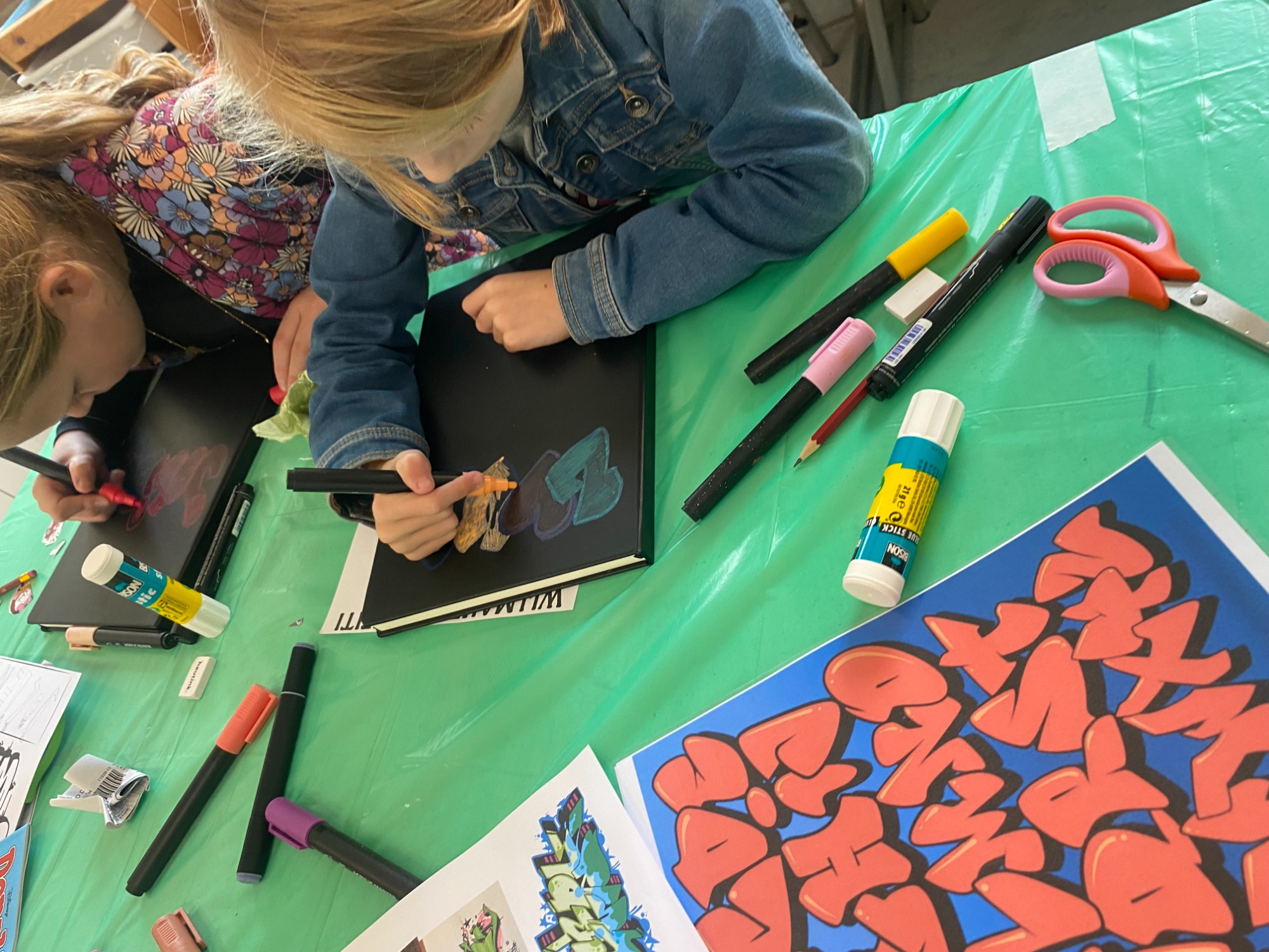 Kinderen leren op een speelse manier de basis van graffiti en maken hun eigen kunstwerk om mee naar huis te nemen.